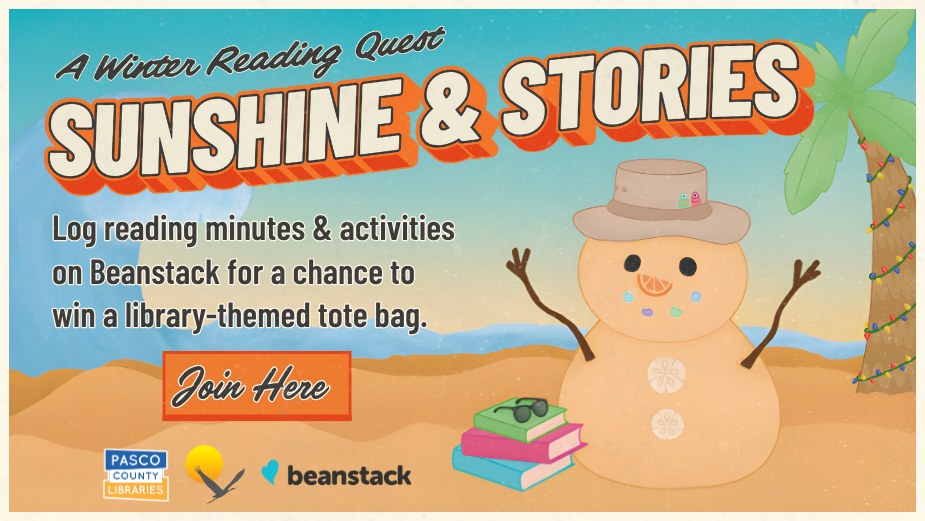 Winter feels warmer when you’re wrapped in a great story! Join us for Sunshine & Stories: A Winter Reading Quest – a chance to read, relax and enjoy Florida’s bright winter days. Soak up the sun with a good library book while logging 300 reading minutes and activities on Beanstack.